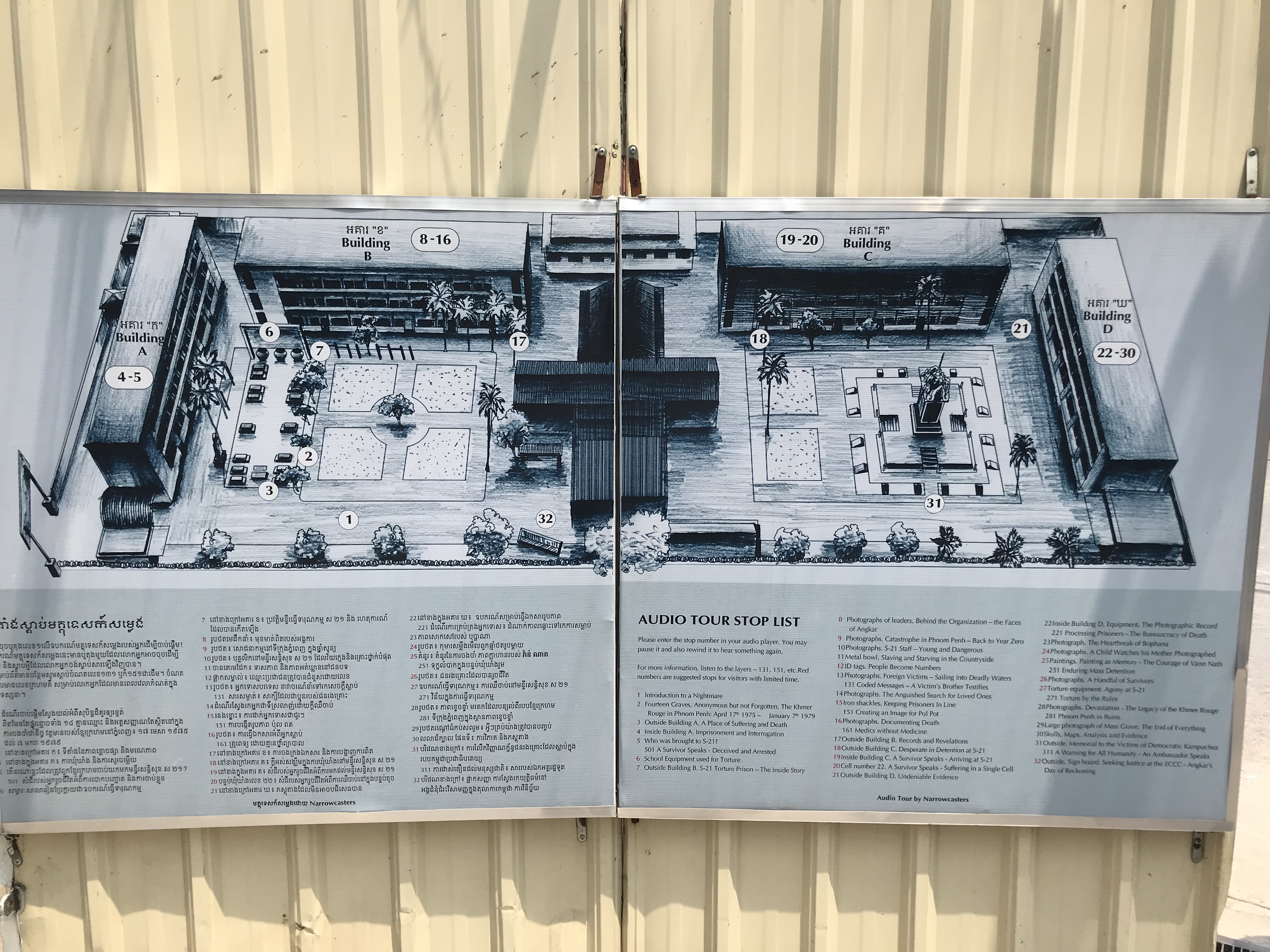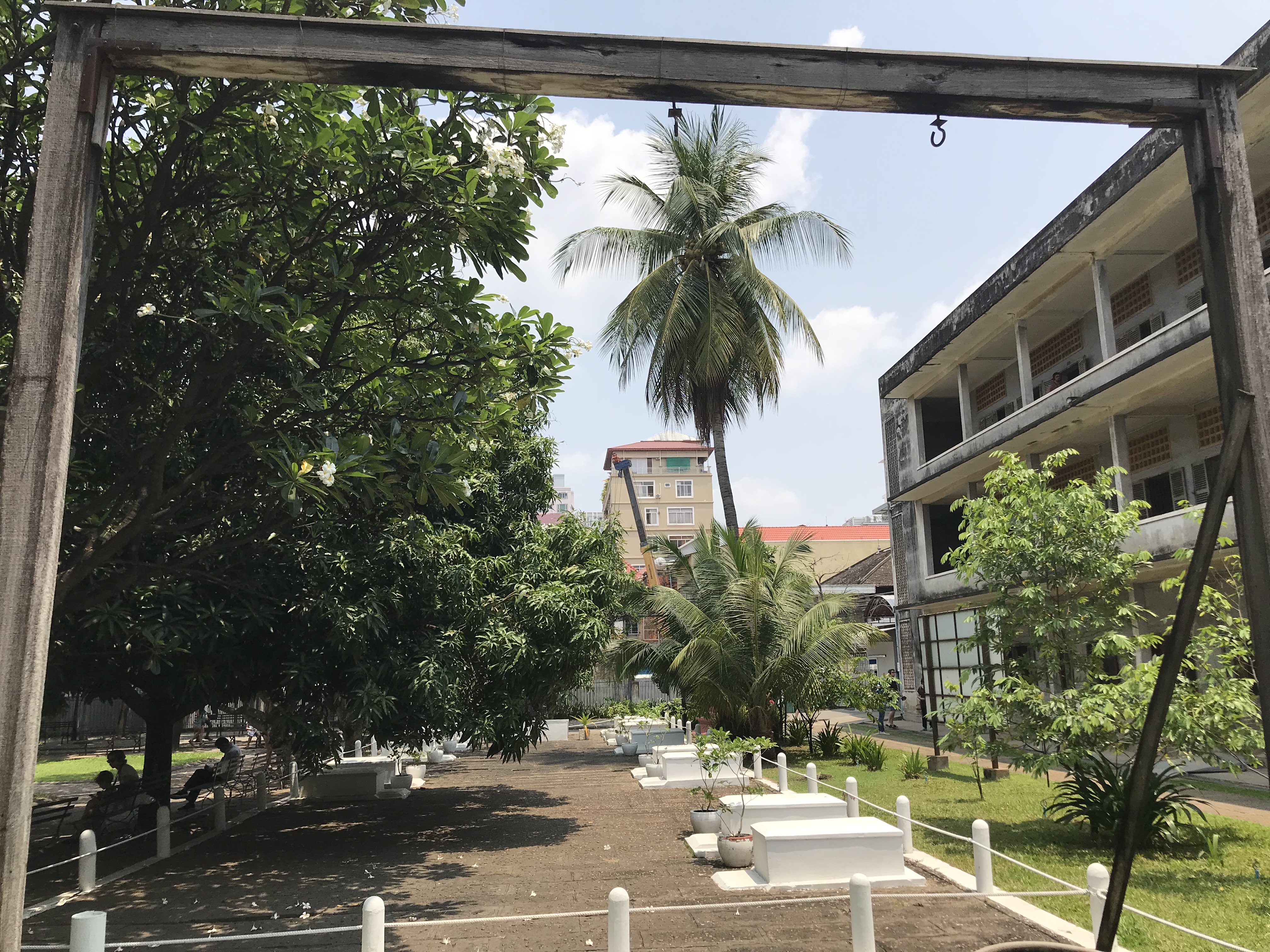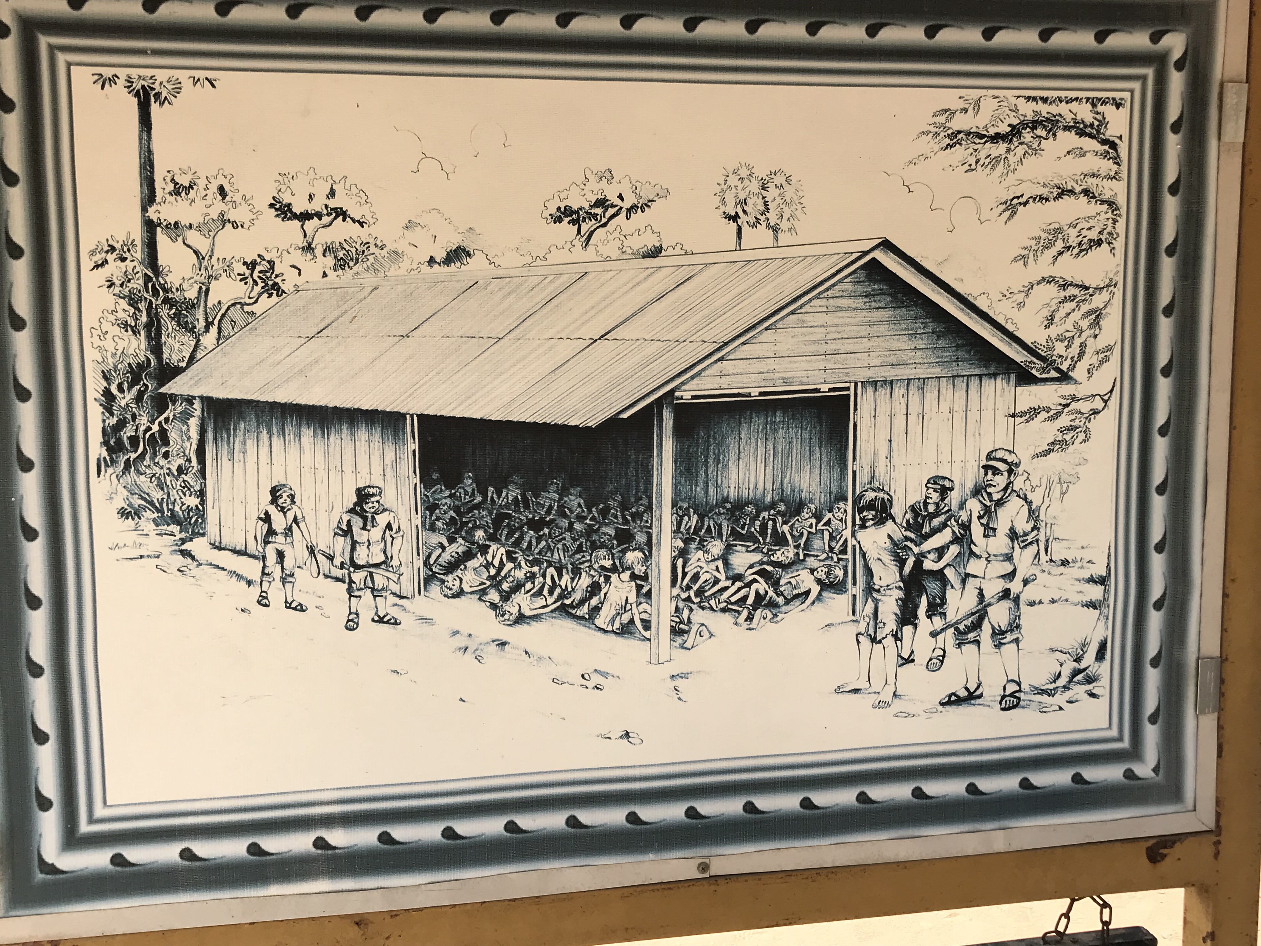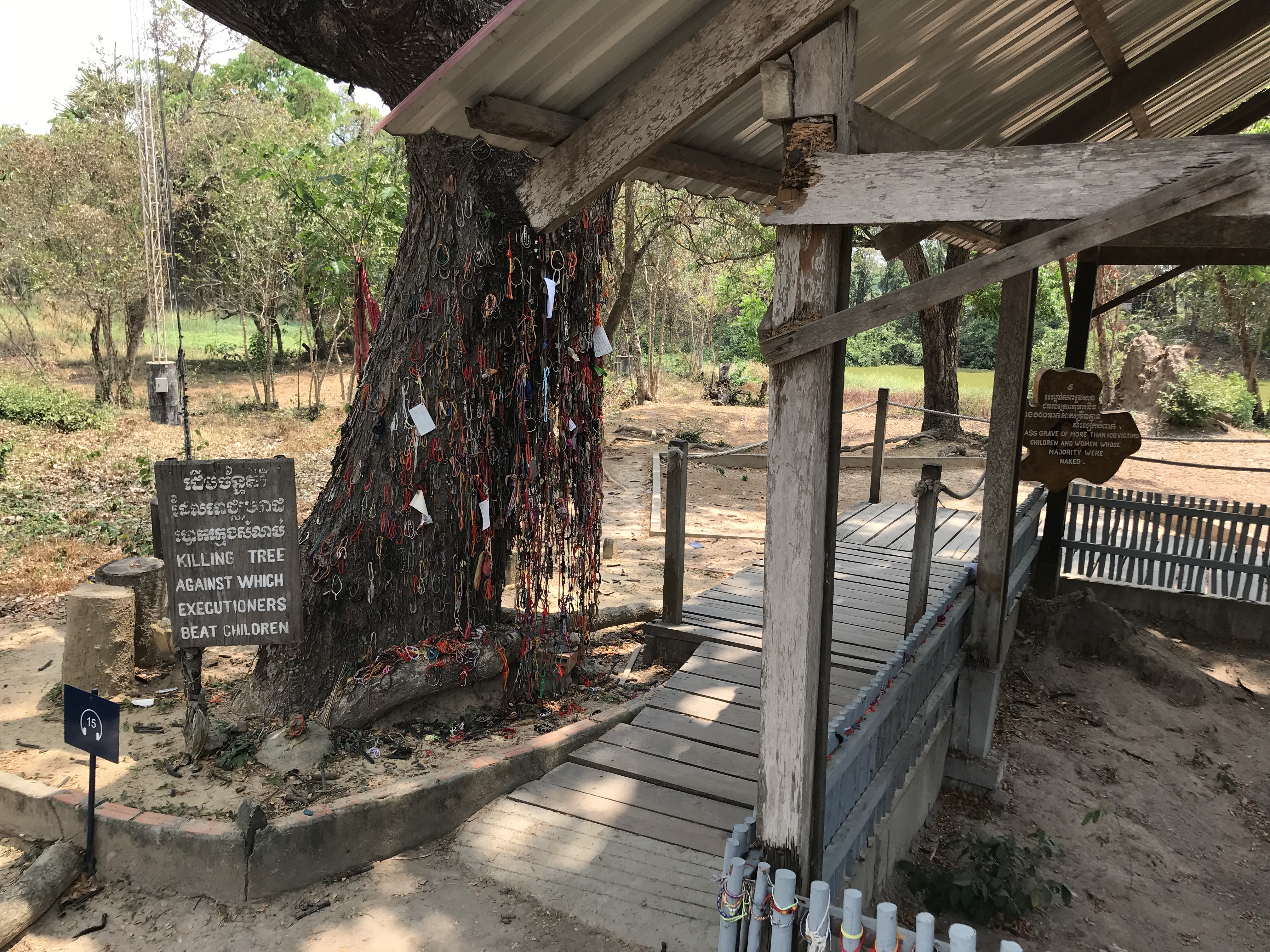 Besonders berüchtigt war das Folterzentrum für wichtige Personen in Phnom Phen in der ehemaligen Schule ‚Tuol Sleng‘, Codename S-21, obwohl mittlerweile bekannt ist, dass es etwa 200 Folterzentren im Land mit jeweils 10.000 bis 60.000 Todesopfern gab. S-21 ist heute eine Gedenkstätte. Starben die Opfer nicht schon während der Folter, wurden sie auf 300 verschiedene sogenannte Killing Fields verschleppt. Um Ressourcen zu sparen, wurden die meisten mit Äxten, Schaufeln und Stöcken erschlagen und dann in Massengräbern verscharrt. Kleinkinder fasste man an den Füßen und schleuderte ihren Kopf gegen einen bestimmten Baum (siehe Foto).