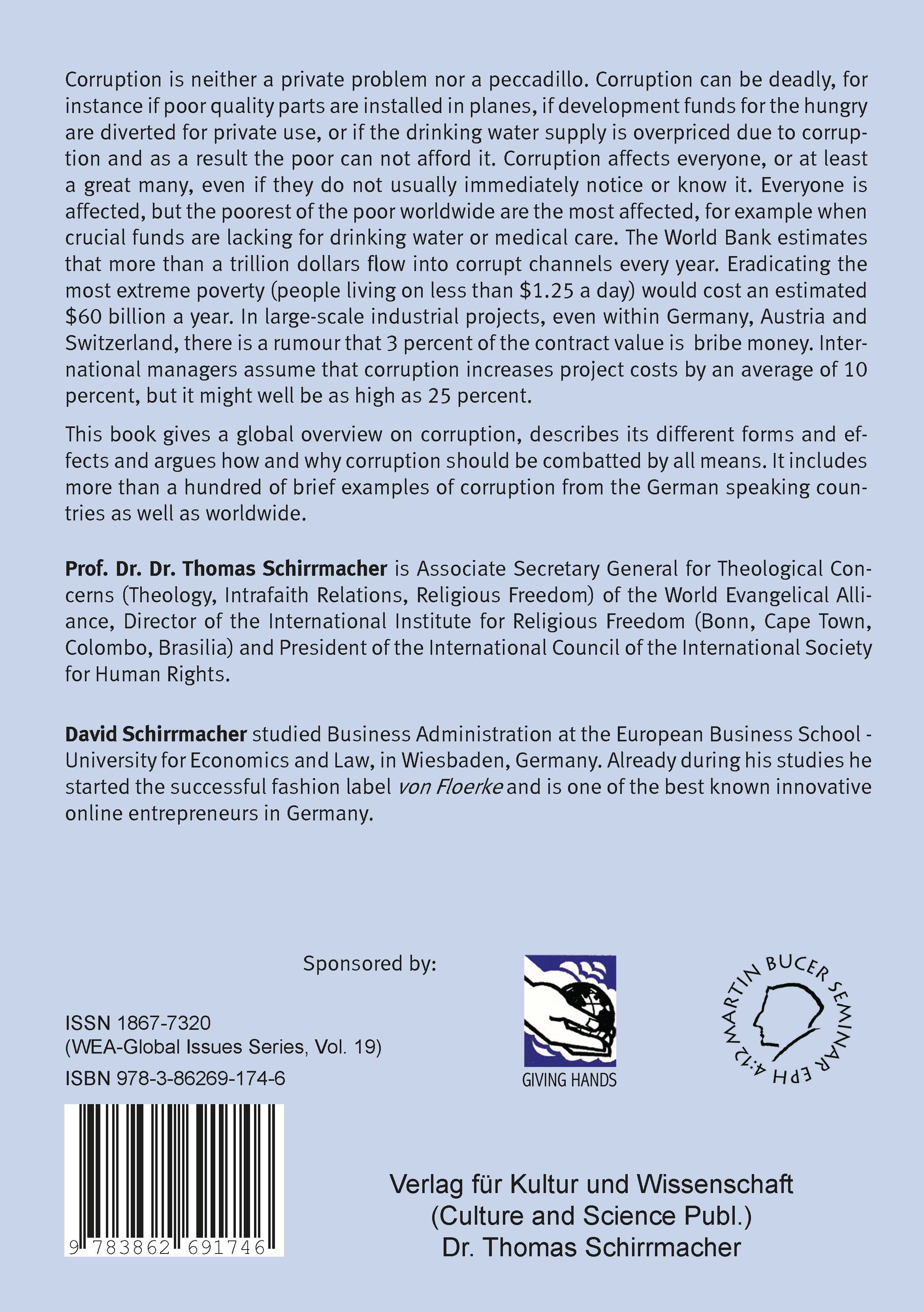 - Thomas und David Schirrmacher. Corruption: When Self-Interest Comes before the Common Good. The WEA Global Issues Series. Bd. 19. Culture and Science Publishing (VKW): Bonn, 2019. ISBN: 978-3-86269-174-6. 94 S.