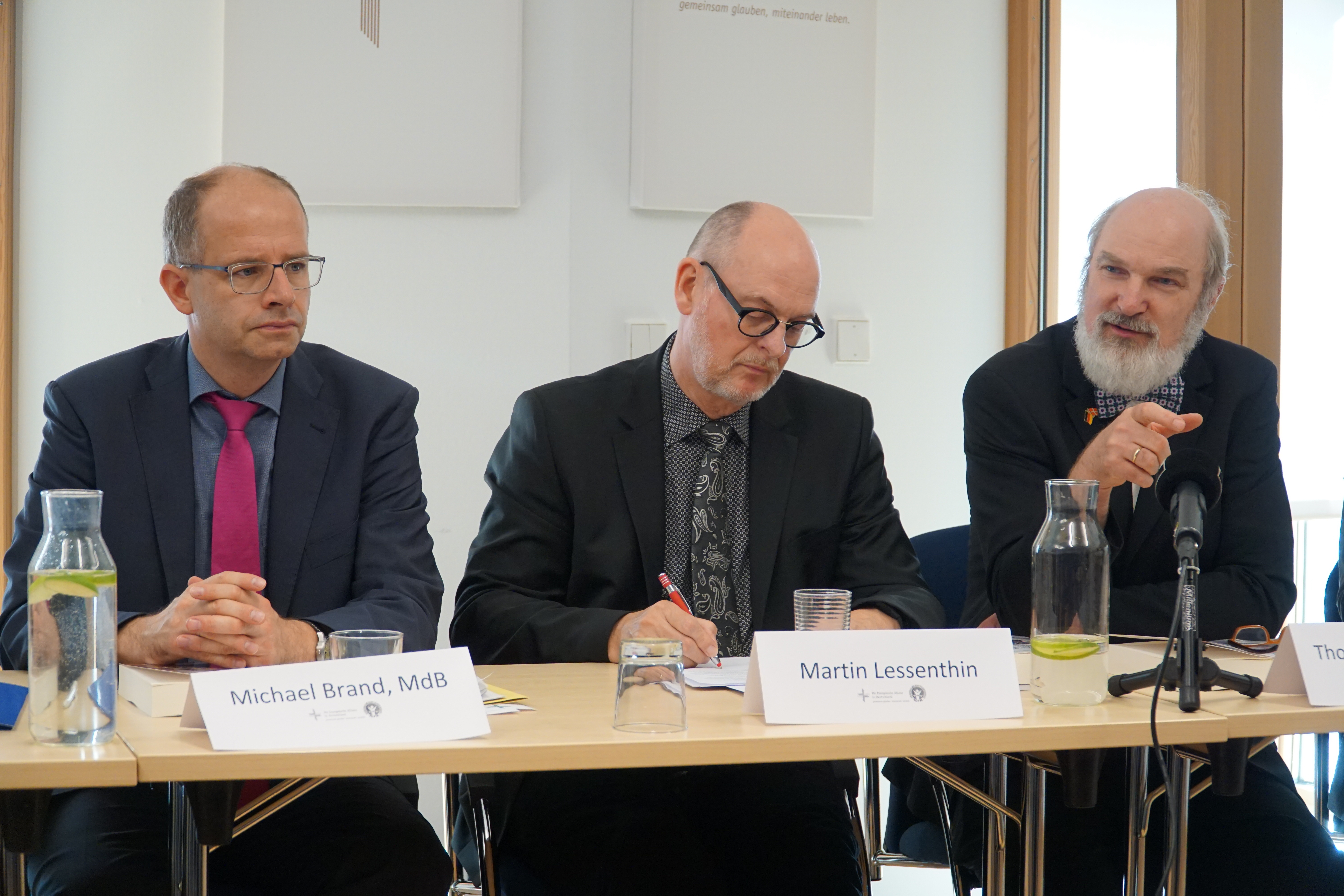 - Foto 2 (v.l.n.r): Uwe Heimowski, Beauftragter der Deutschen Evangelischen Allianz e.V. am Sitz des Bundestages und der Bundesregierung, Martin Lessenthin, Sprecher des Vorstands der Internationalen Gesellschaft für Menschenrechte (IGFM, Deutsche Sektion e.V.), und Prof. Dr. mult. Thomas Schirrmacher, Herausgeber der Jahrbücher Religionsfreiheit und Christenverfolgung, President of the Council of the International Society for Human Rights (ISHR) © BQ/Warnecke