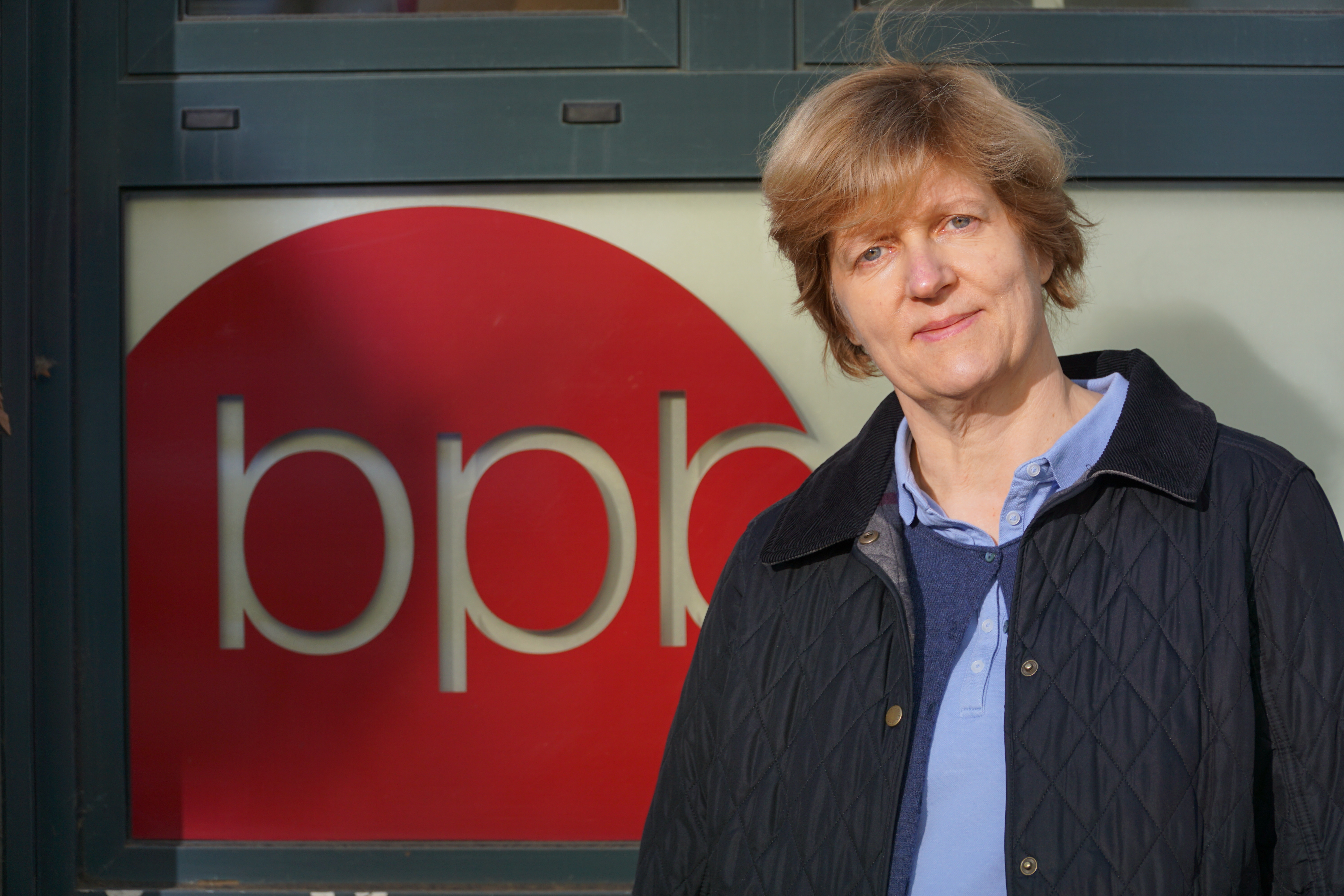 - Foto 1: Christine Schirrmacher mit dem Logo der Bundeszentrale in Bonn © BQ/Warnecke