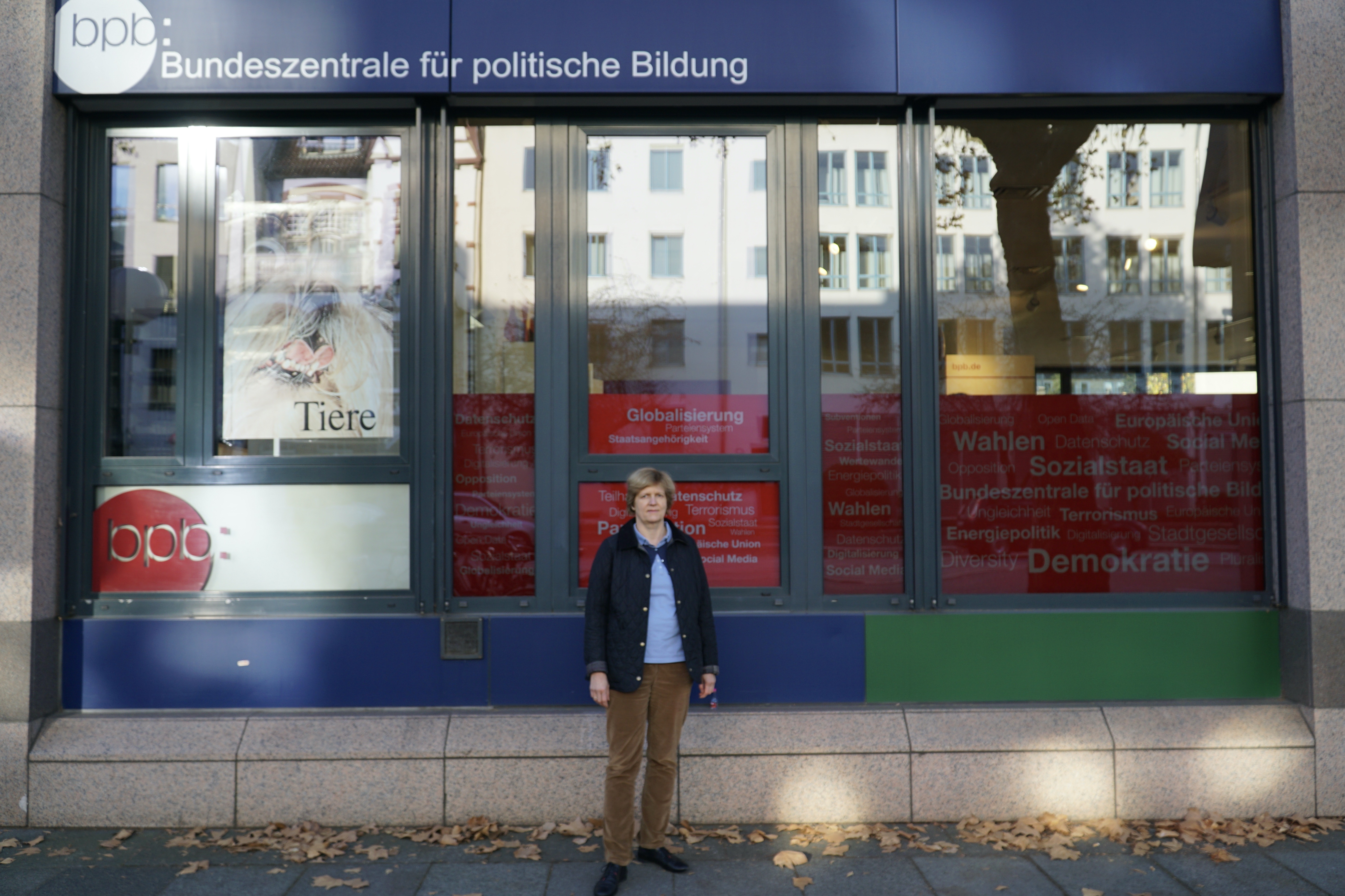 - Foto 2: Christine Schirrmacher vor der Bundeszentrale in Bonn © BQ/Warnecke