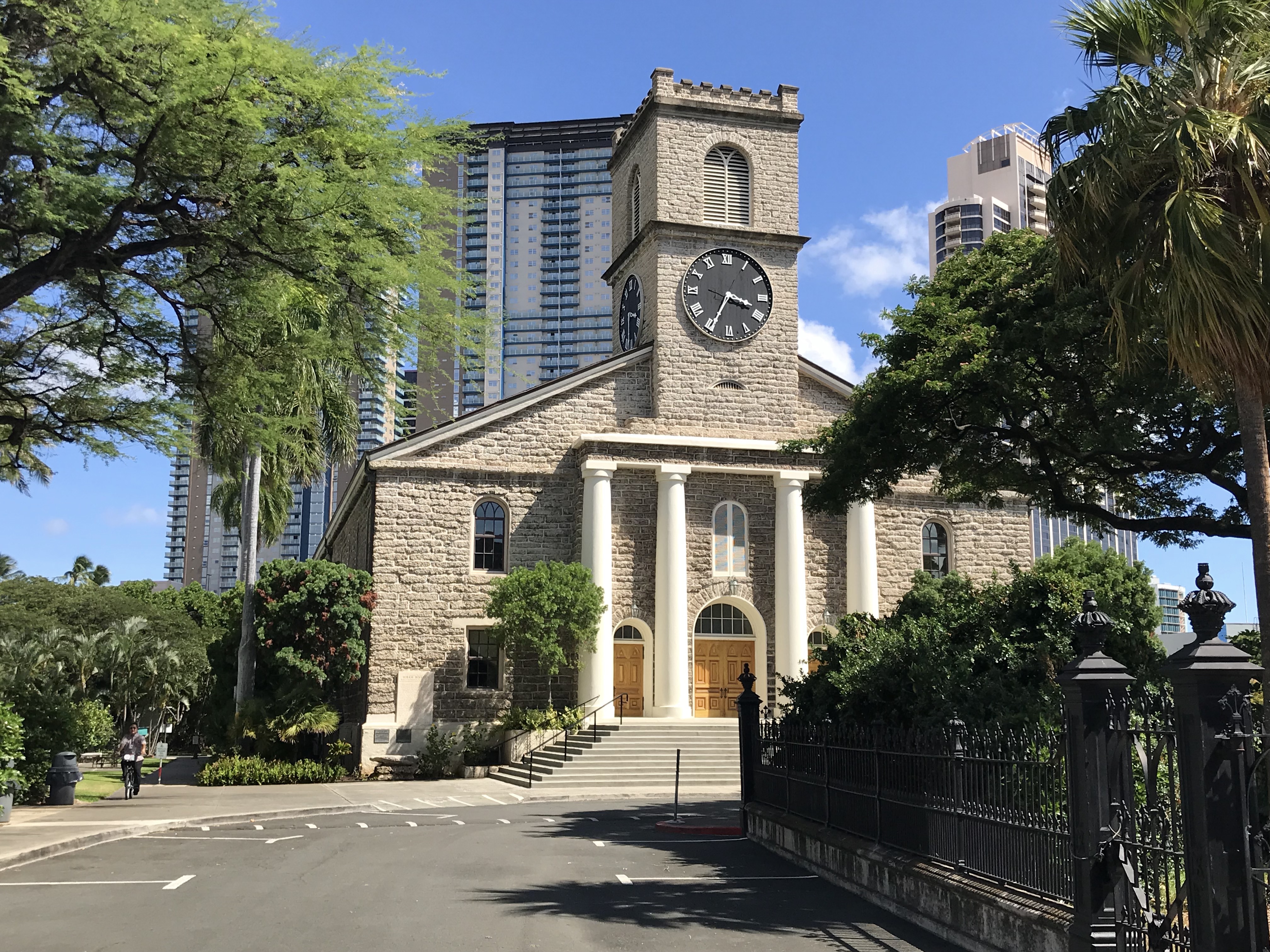 In Honolulu besuchten sie die Kawaiaha’o Church, O’ahu, die 1836–1842 von den ersten Christen aus 14.000 Korallenblöcken, die Taucher nach oben geholt hatten, erbaut wurde.