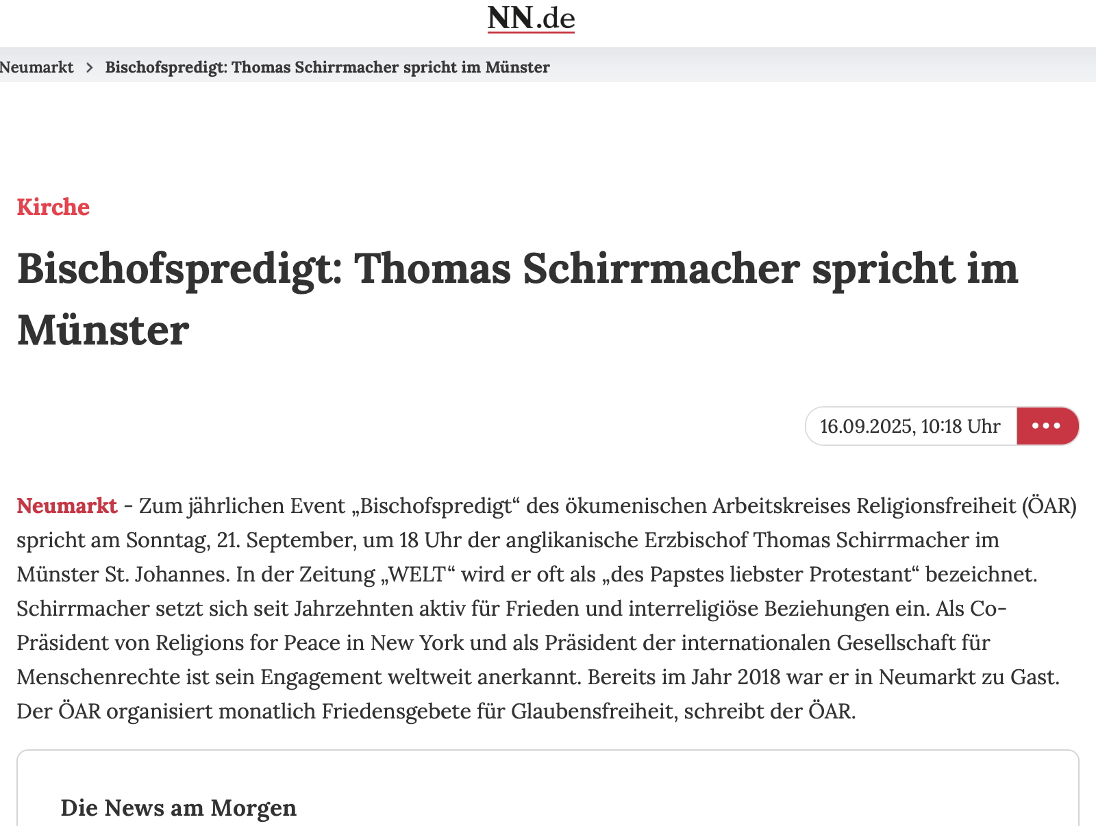 „Auf Einladung von Ruhestands-Pfarrer Ernst Herbert kam Erzbischof Thomas Schirrmacher zum zweiten Mal zum Arbeitskreis für Religionsfreiheit nach Neumarkt und hielt bei der Abendmesse im Münster Sankt Johannes, der Domkapitular Norbert Winner vorstand, die Predigt. Der 65-jährige Schirrmacher ist Präsident der Internationalen Gesellschaft für Menschenrechte und Präsident des Internationalen Instituts für Religionsfreiheit. Außerdem war er bis zum Jahr 2024 Generalsekretär der Weltweiten Evangelischen Allianz mit rund 600 Millionen Christen. Andreas Grell nahm seine letzte offizielle Aufgabe als stellvertretender evangelischer Dekan in Neumarkt wahr, ehe er nach Coburg geht. Er begrüßte den hohen Gast mit dem Zitat ‚Er ist des Papstes liebster Protestant‘. Bischof Schirrmacher traf nämlich mehrere Male mit dem verstorbenen Papst Franziskus zusammen. In seiner Predigt betonte der Würdenträger, dass jede Art von Zwangsmissionierung falsch sei. ‚Der Glaube kann nicht aufgezwungen werden, sondern er muss freiwillig erfolgen‘, sagte er. In zahlreichen Ländern Asiens und Afrikas mit fehlender Religionsfreiheit sei der Anstieg der Zahl der Christen enorm, das glatte Gegenteil zu Europa. Auf der politischen Ebene gebe es keine Alternative zum Dialog. ‚Die Waffen sind nicht in der Lage, dauerhaften Frieden und Wohlstand zu schaffen‘, sagte er zu den derzeit wütenden Kriegen. Der Kirchenbesuch in Russland sei deshalb sehr niedrig, weil dort die extremistische Politik in die Kirche hineingezogen werde.“